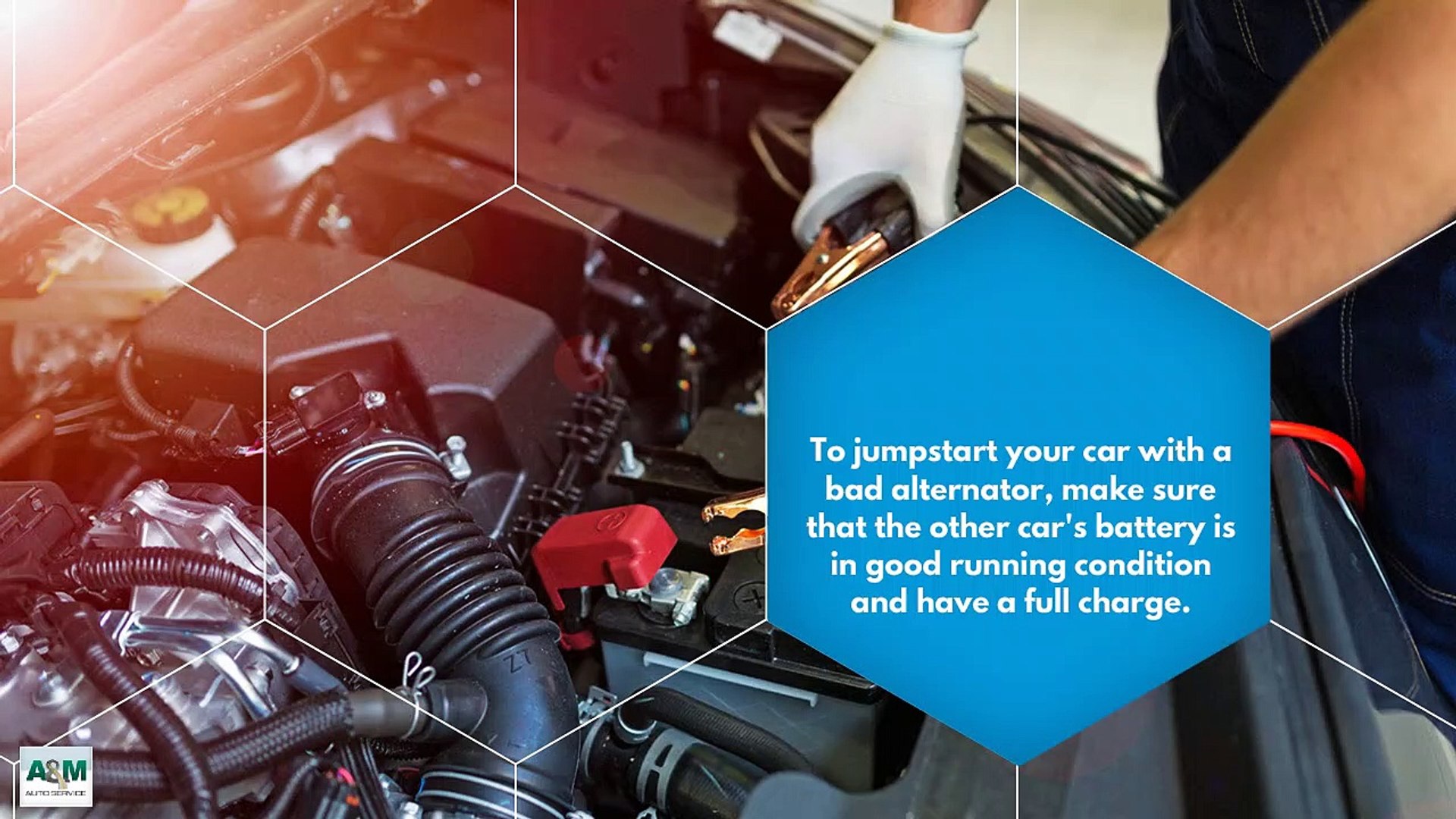 A car with a bad alternator needs help from another car to jump-start Pop the hood of the two vehicles and connect the red wire on the jumper cable to the positive terminal of the car with the good battery while the battery is still placed in the car. You actually can jumpstart a car with a bad alternator and the car will keep running for some time no matter how bad the alternator is well considering you have a good battery. The jumpstart will be enough to power your fuel injectors and engine control unit.
